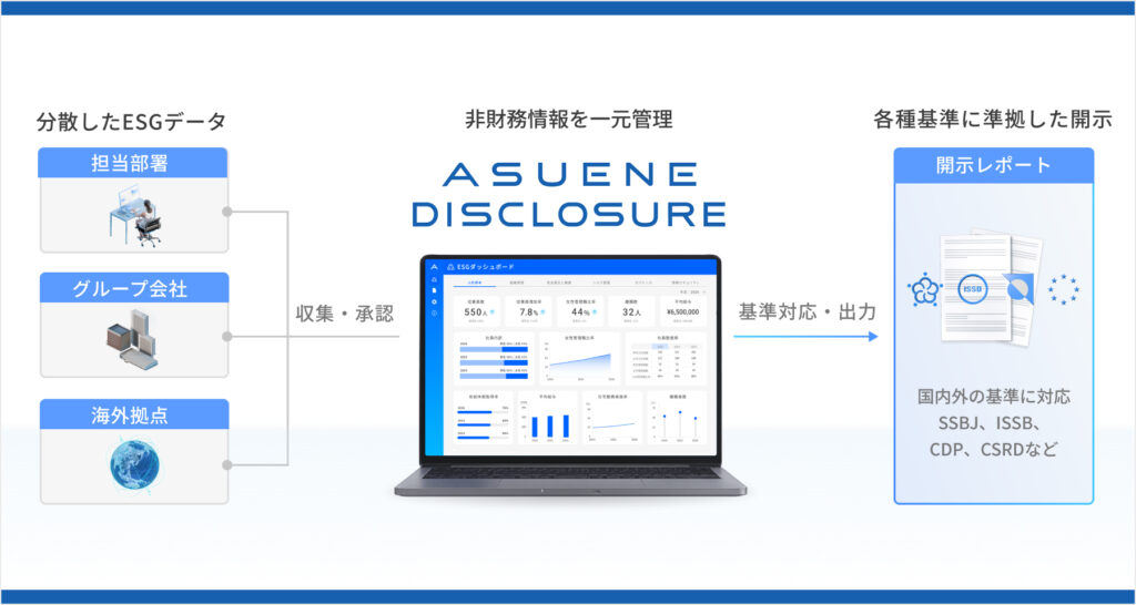 当社は、こうしたニーズに応えるため、「ASUENE」のESGレポート機能、「ESGデータ管理機能」をより多くのステークホルダーが利用しやすい「ASUENE DISCLOSURE」としての提供を開始します。これにより、社内の各部門に点在するESG情報を「ASUENE」へ集約し、一元管理することが可能になります。蓄積された正確なデータを活用することで、SSBJ(日本サステナビリティ基準委員会)をはじめとする複雑な開示要請に対しても、情報収集からレポート作成までを「ASUENE」上で完結し、効率的に対応できるようになります。